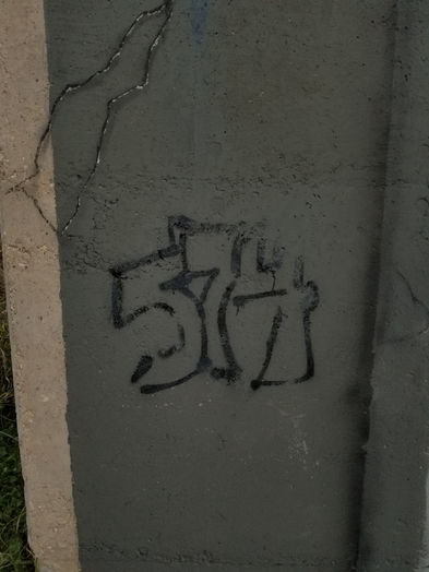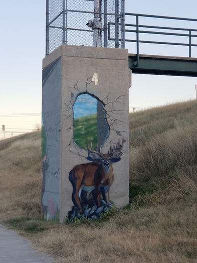 This piece is an anamorphic mural created for the Tarrant Regional Water District’s Trinity Trails. It honors native wildlife as well as the Native peoples who once lived in the area. The mural depicts a time after humans, when nature has gone on (perhaps better) without us. The decrepit structure and aging graffiti show signs of how human intervention can mar the otherwise beautiful landscape. The medicine wheel, birds and "574" (the number of federally-recognized Native tribes in the U.S.) honor those who respected the land more than our current civilization tends to do. The "J.P. + L.P." is a personal mark and refers to the initials of my children.