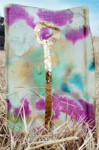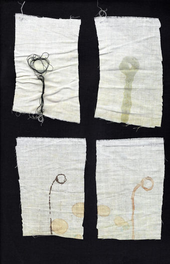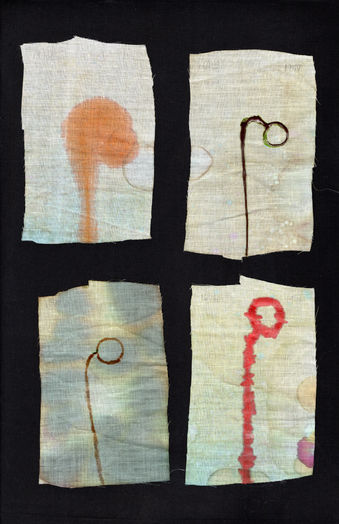 Each panel is cut from a sheet of cotton fabric and colored with alcohol inks. The number and year are written at the top with graphite. Additional media are listed below.