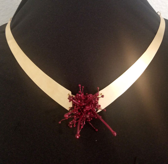 This piece is a commentary on the current state of affairs. I always believed that we would come together as a people in a time of crisis. Sadly, I was mistaken. We seem to be more divisive than ever. People huddle with others on their side, represented here by red and blue (a not-so-subtle nod to US political parties), with nothing but empty space in the middle-ground. This adornment is meant to be worn with one color on the front and one on the back, making it nearly impossible to wear comfortably. The wearer will be unable to lean against a wall or sit back in a chair. If we were all on the same side – the side of humanity – this would not be a problem and the piece could be worn comfortably.